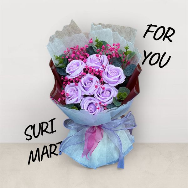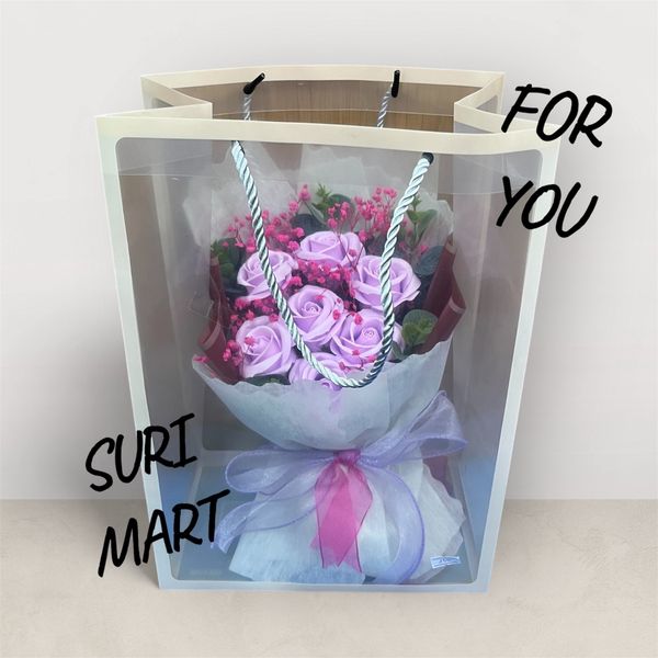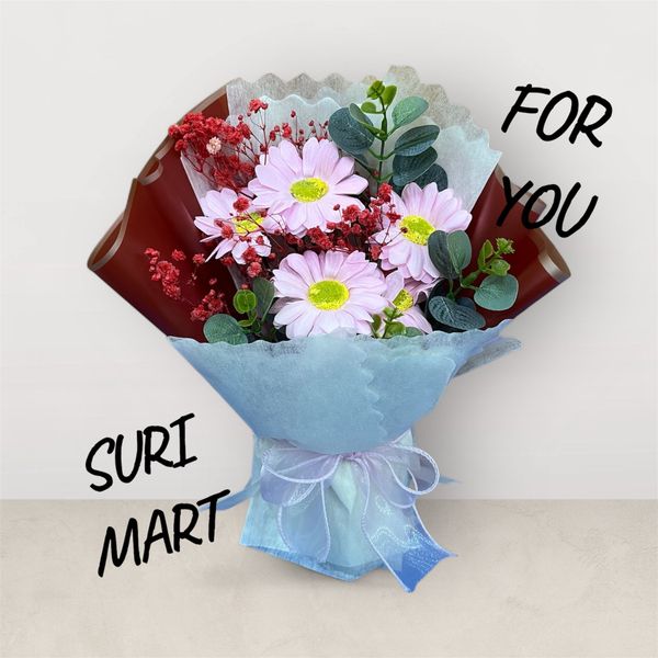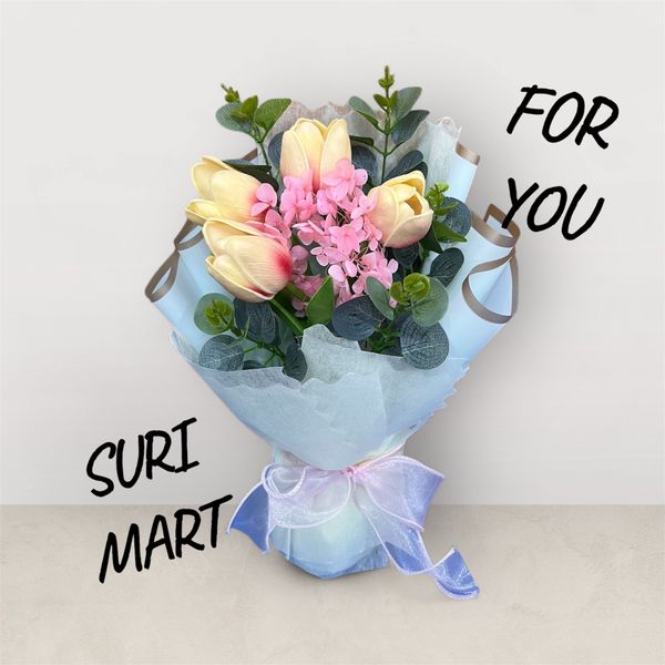 Bó hoa sáp Surimart được phối cùng hoa bi nhỏ, lá xanh và nơ ruy băng hai lớp. Kèm túi nhựa trong suốt hiện đại – sang trọng mà vẫn nhẹ nhàng, thanh lịch.